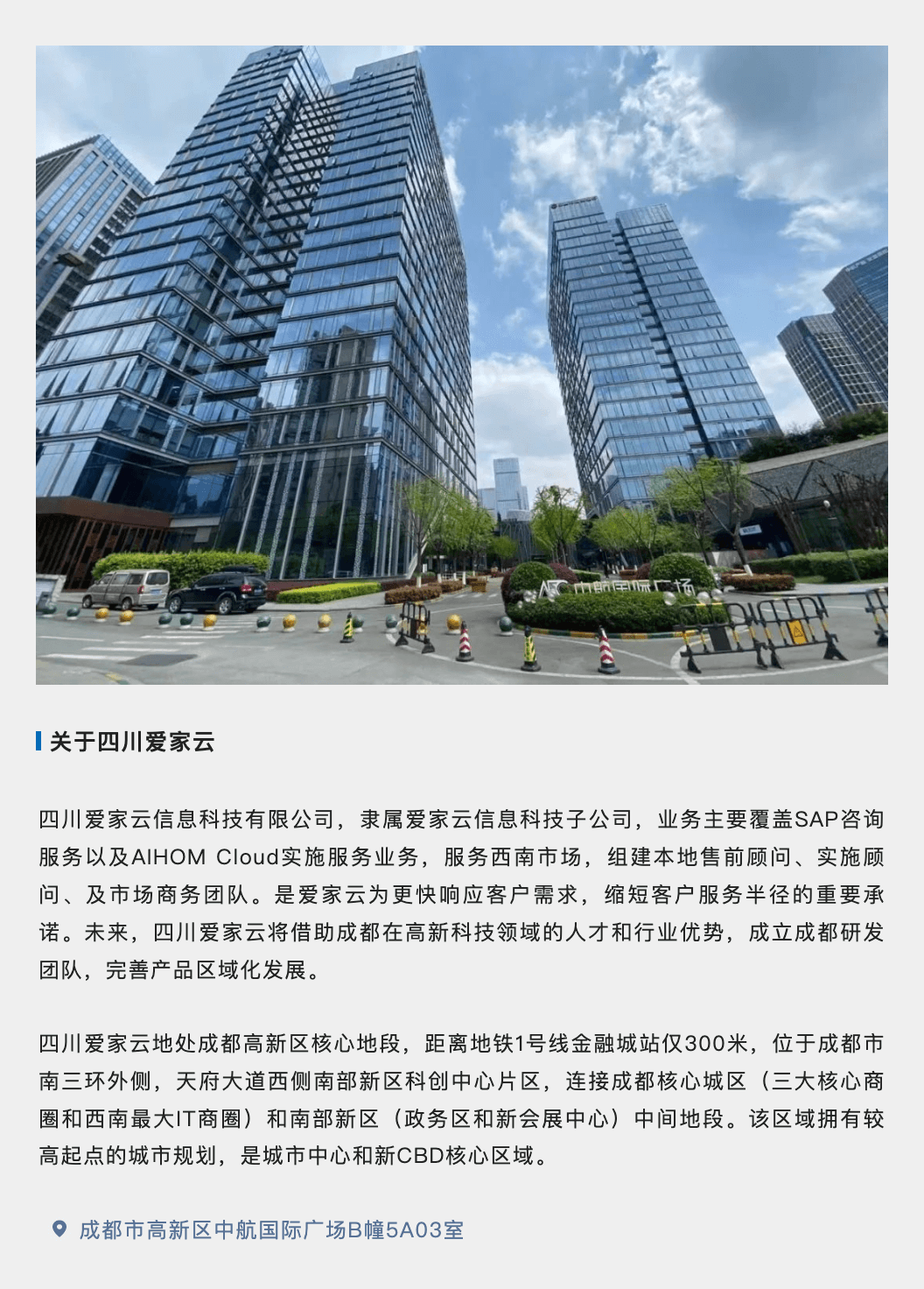 3月23日,愛家云信息科技子公司,四川愛家云信息科技有限公司(以下簡稱“四川愛家云”)正式開業(yè),是愛家云繼華南廣州總部、華東上海分公司后,四川愛家云正式落戶成都。服務(wù)覆蓋的西南區(qū)域,肩負著數(shù)字化服務(wù)西南的使命和決心,秉持更貼近客戶,更好的產(chǎn)品和服務(wù)的戰(zhàn)略。