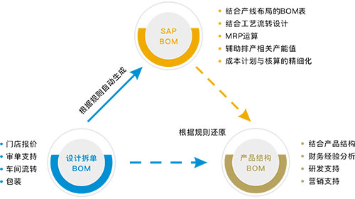 基于行業(yè)特色,拆單后的扁平料單BOM如何自動(dòng)轉(zhuǎn)化為ERP BOM和產(chǎn)品設(shè)計(jì)BOM,用以支持企業(yè)內(nèi)控和顆粒度和研發(fā)方向支撐。 我們提倡綜合企業(yè)車(chē)間/產(chǎn)線布局的大部件層級(jí),采用SAP系統(tǒng)核心套裝BOM和訂單BOM相結(jié)合的方案。 定制行業(yè)零售模式下每個(gè)柜子都是獨(dú)一無(wú)二的,如何在ERP系統(tǒng)中柜子的編碼管控也面臨很大挑戰(zhàn),傳統(tǒng)的一物一碼顯然是不可行的。